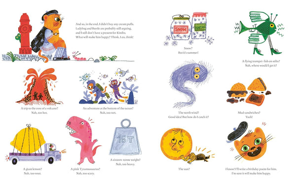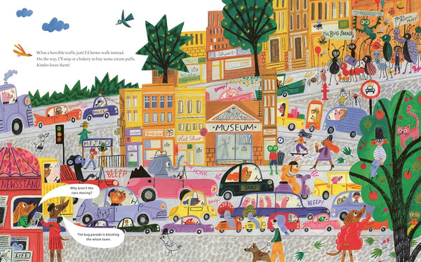There is so much to see in this zany city: there's a bug parade, a shop selling rhymes, a busy bakery selling cream puffs and ice cream, a Robo-Dog dancing in the park, and so much more!