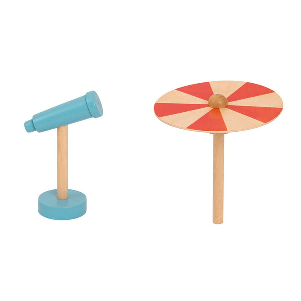 A tree house is the perfect place to play! It can be accessed via the rope ladder or across a bridge suspended from a neighbouring tree. It is made entirely of wood and can be dismantled. It even has a set of garden furniture for relaxing in the shade! Coordinates perfectly with the Moulin Roty dollhouse.