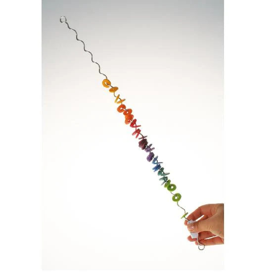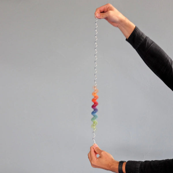 Simple yet smart, fascinating and colorful. Hold the spirelli upright, then turn upside down and watch the wooden rings cascade down the spiral, making a cool whooshing sound as they go.