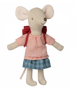 A big sister mouse is dressed for a day in kindergarten or school as she is bringing her backpack. She has magnets in her hands so she can hold the tricycle handles tight for the fast trip.